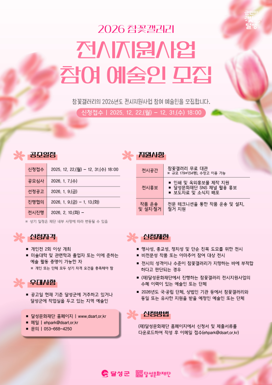 - (재) 달성문화재단에서 진행하는 참꽃갤러리 전시지원사업의 수혜 이력이 있는 예술인 또는 단체