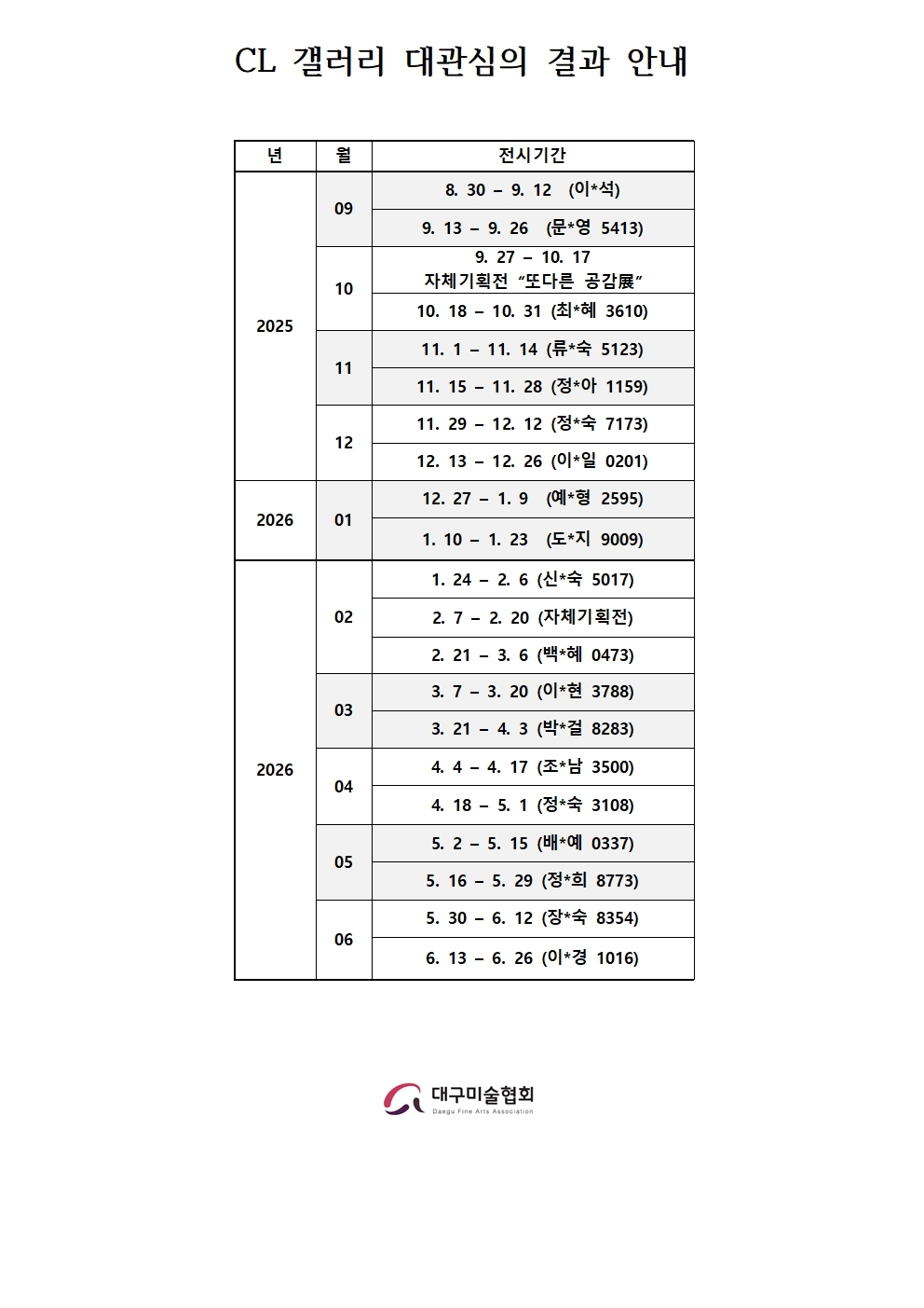 [2025∼2026 대구미술협회 CL갤러리 대관 결과 안내]