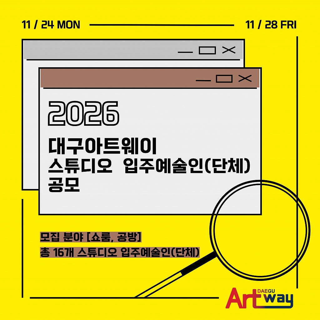 (재)대구문화예술진흥원 대구아트웨이에서 입주예술인(단체)을 모집합니다. 대구아트웨이는 범어역 지하도에 위치한 복합문화공간입니다. 2026년 대구아트웨이는 문화예술 유통·소비 중심의 지역예술인 활동거점을 제공하고 예술인과 시민이 만나는 일상 속 문화예술을 실현함으로써 지역 예술인의 자립기반 구축과 시민 문화향유권 증진을 도모합니다. 지역 예술인(단체)의 많은 관심과 참여를 바랍니다.
