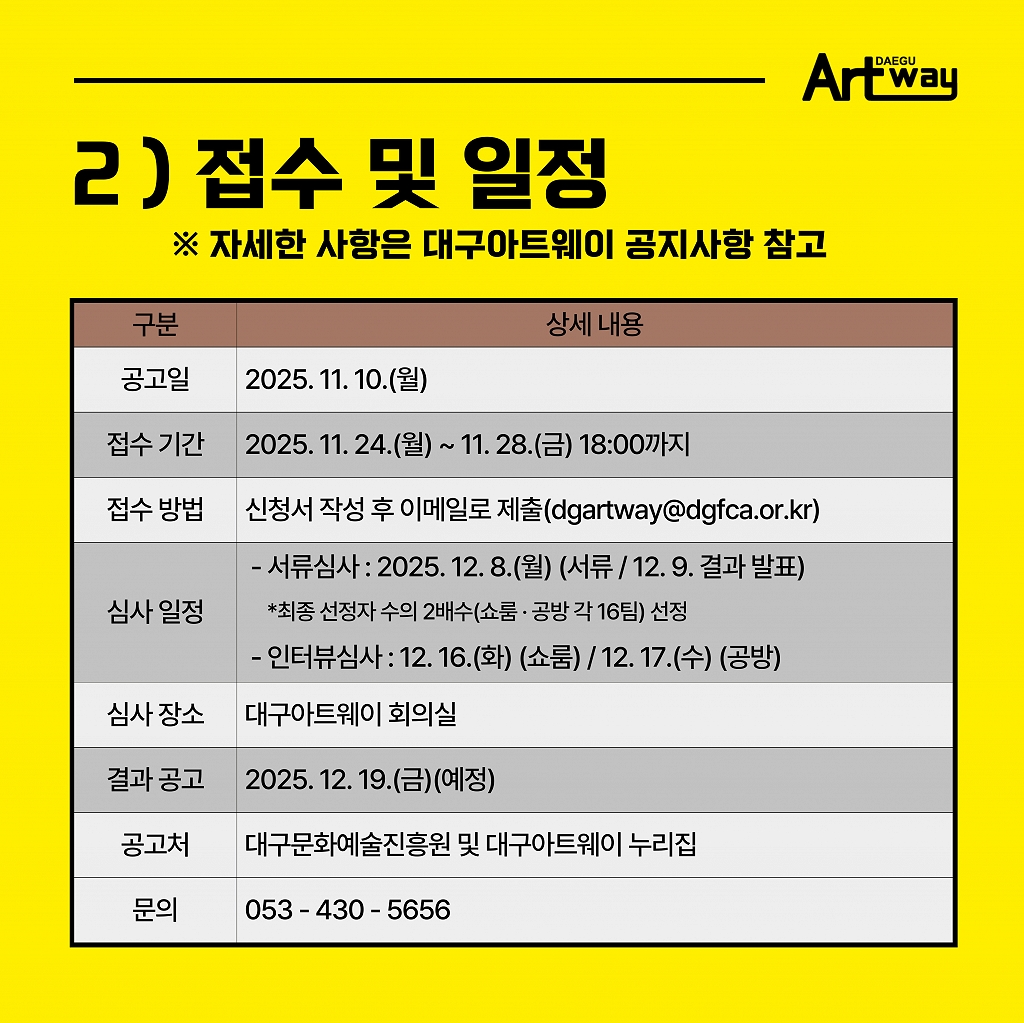 ❍ 접수방법 : 신청서 작성 후 이메일로 제출(dgartway@dgfca.or.kr)